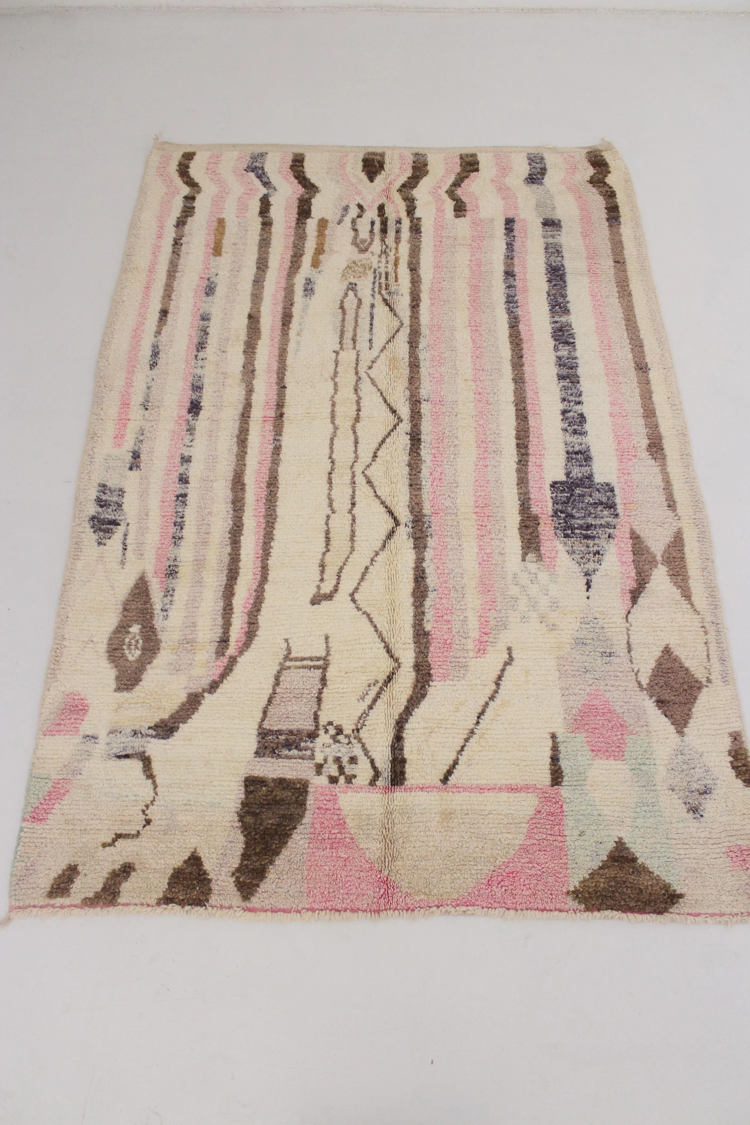 The large diamond shape patterns are protective amulets to ward off the evil eye, and the border patterns are a Berber symbol referred to as ‘the frog’ which is a symbol of fertility. This piece came from a shop in the rug souk of the ancient Medina of Marrakech, from a family rug business that is now in its third generation and was founded in the 1970’s by a former farmer from Northern Moroccan.