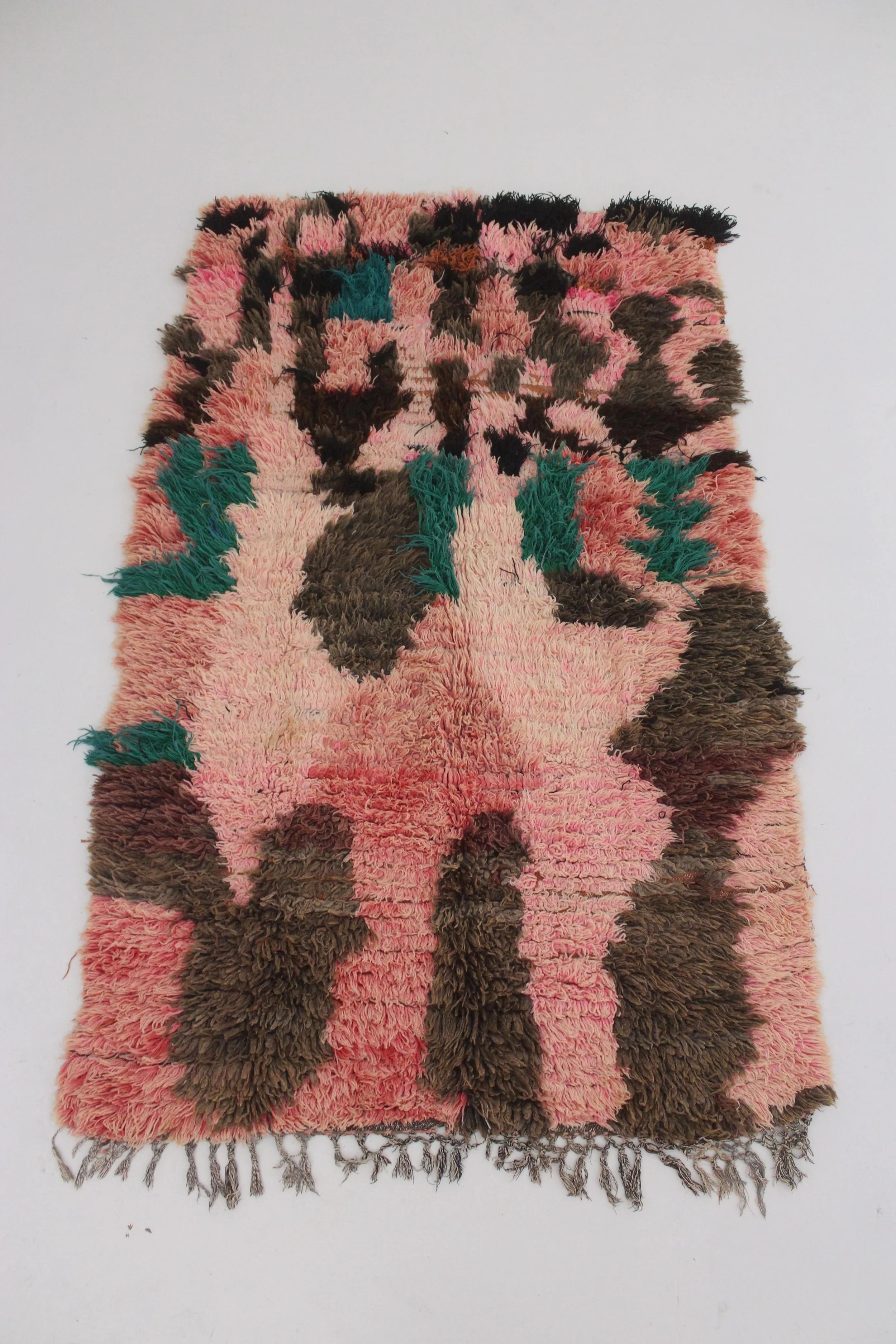 Vintage Boujaad 1960’s High pile shaggy shag by Zoubida. This high pile, shaggy rug was woven to keep warm during the cold winter months. The name of the original weaver is Zoubida - she’s now 78! The pattern & colors were inspired by a huge forest fire that happened in the region.